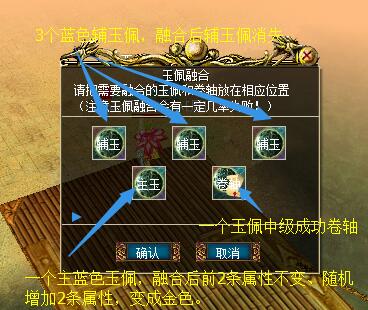 需要材料:1个主蓝色玉佩(融属性保证前2条属性是自己需要的,融合后前2条属性不变,后面增加为2条属性)、3个蓝色辅玉佩(融合后消失)、1个<玉佩[中级]成功卷轴>