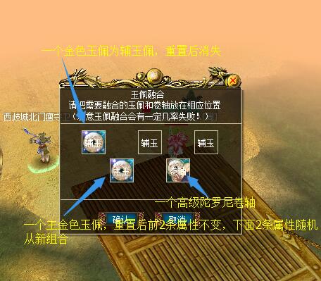 需要材料:1个主金色玉佩(重置后保持前2条属性不变-属性强度随机改变,后2条属性从新随机组合),1个高级陀罗尼,一个金玉佩(融合后消失)